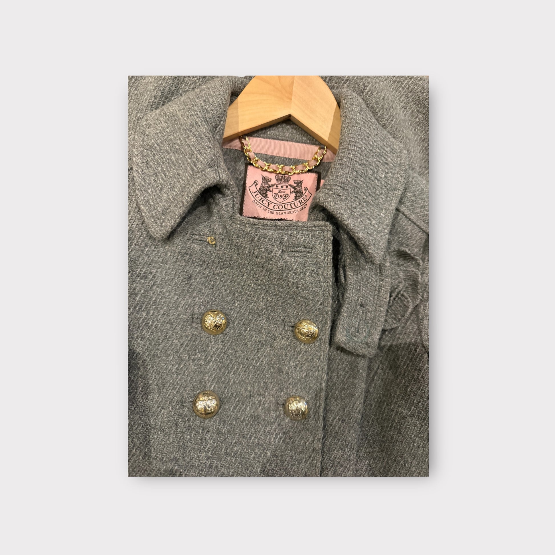Chic and timeless Juicy Couture double-breasted coat in a beautiful gray tone with statement gold buttons. Tailored silhouette that flatters the waist and gives a polished, structured look — perfect for fall and winter.