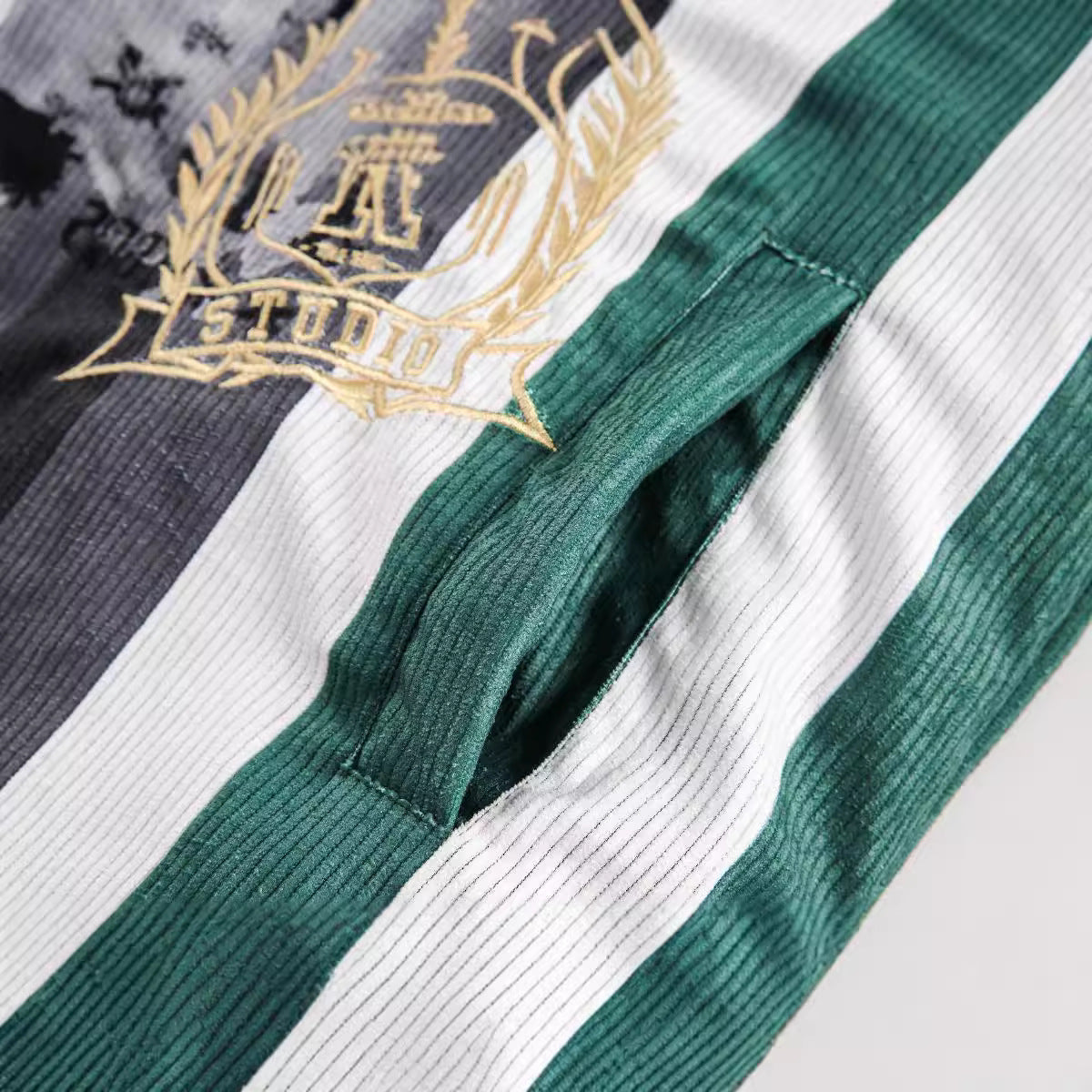A reworked striped patchwork jacket featuring bold contrast panels and the signature “09” detailing. Crafted from repurposed fabrics, each piece is uniquely composed, celebrating individuality and sustainable craftsmanship with a modern, street-style edge.