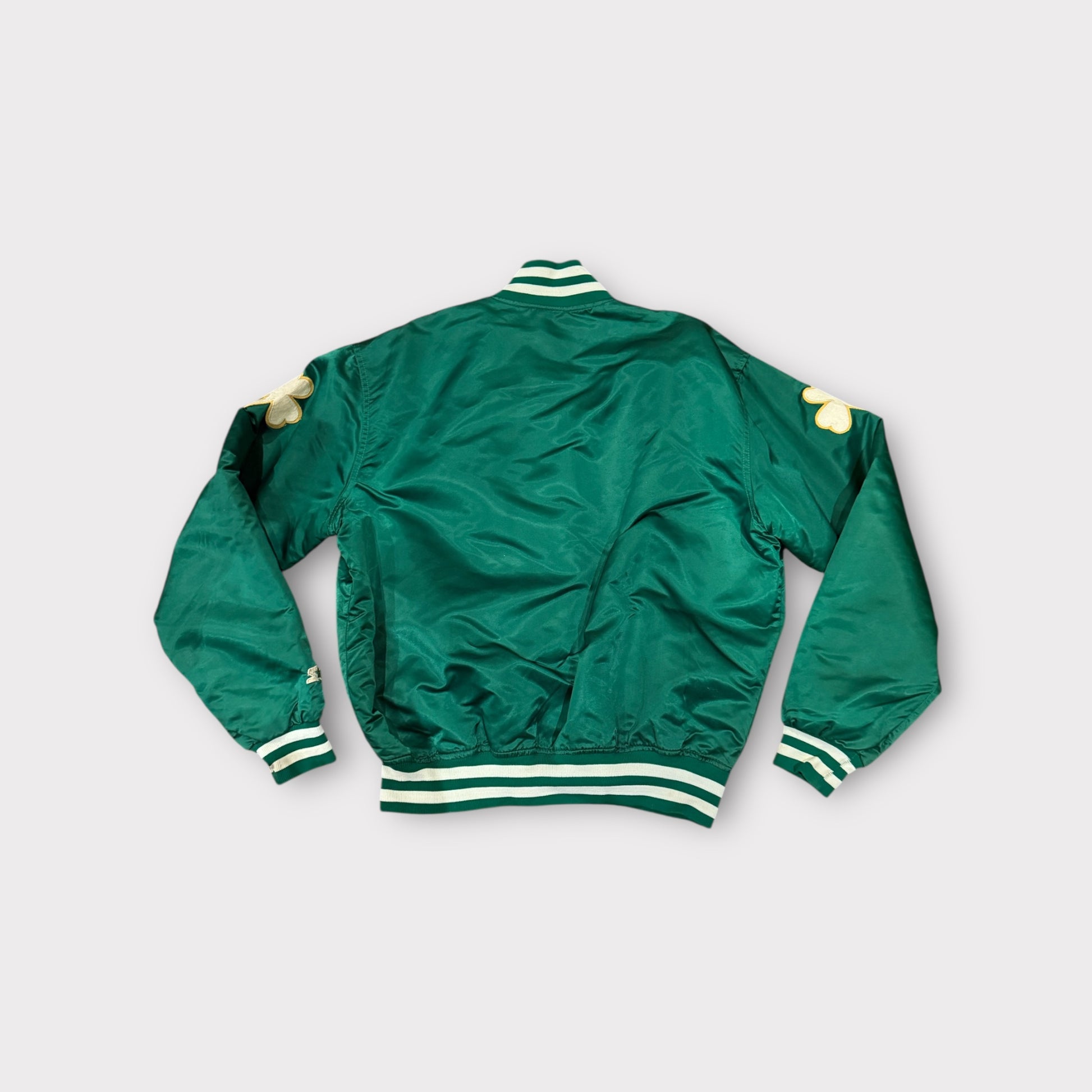 Authentic vintage 1980s Starter Boston Celtics jacket in vibrant green. This classic nylon button-down jacket captures the iconic NBA style of the era. Made for fans and collectors alike, it’s a standout piece from basketball history.