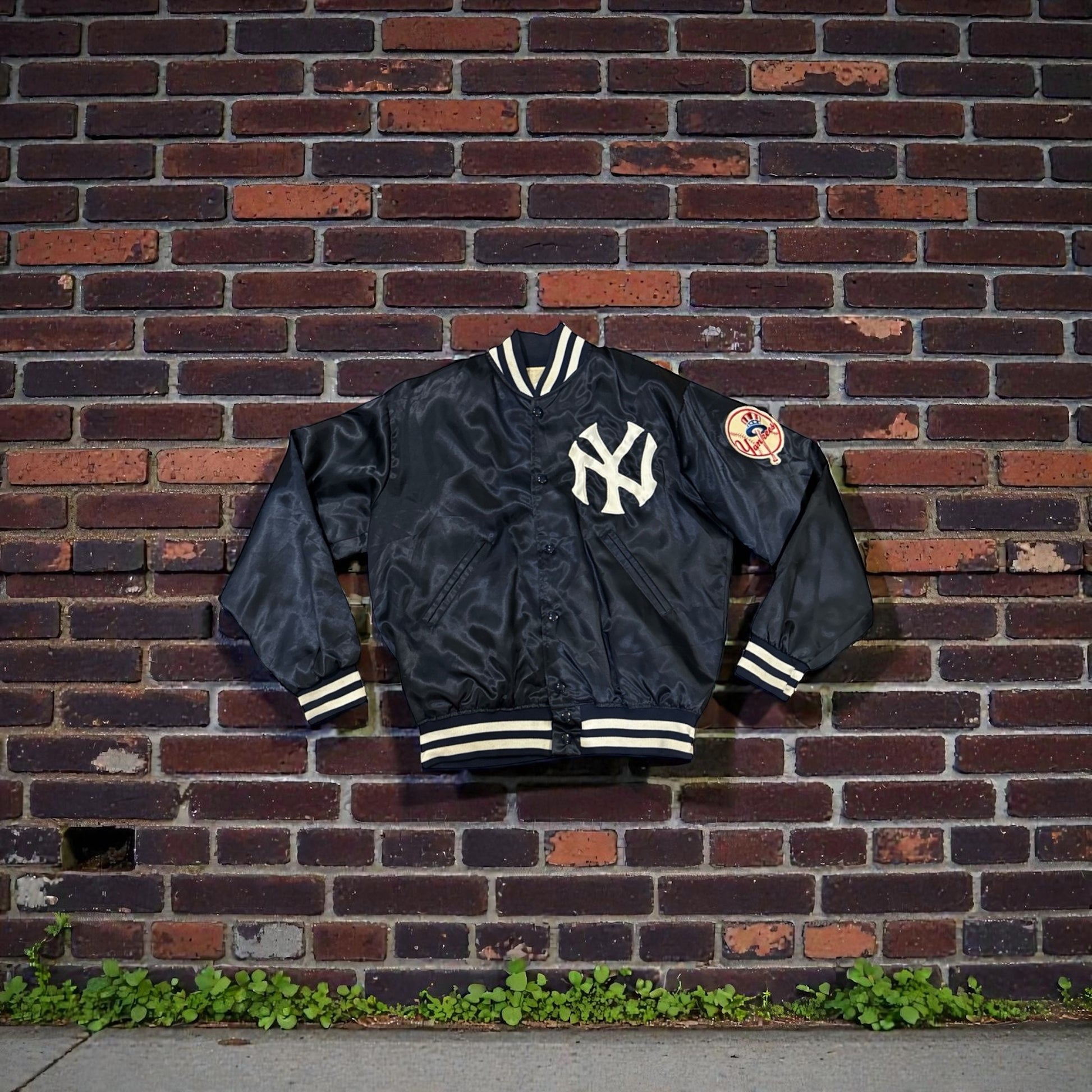 Classic vintage New York Yankees satin jacket by Felco, made in the USA. This iconic piece features a rich navy blue satin finish with authentic Yankees branding, making it a must-have for MLB fans and vintage sportswear collectors.